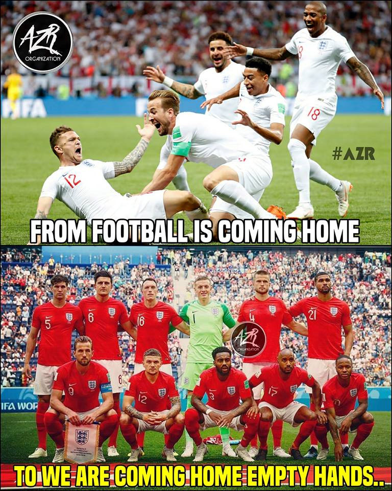 Bị tuyển Bỉ dập tắt mọi hy vọng đạt huy chương đồng World Cup, Anh đành tay trắng ra về. Câu khẩu hiệu được cổ động viên nước này yêu thích "It's coming home" cũng trở thành đề tài chính của loạt ảnh chế trên mạng. Ảnh: AZR.