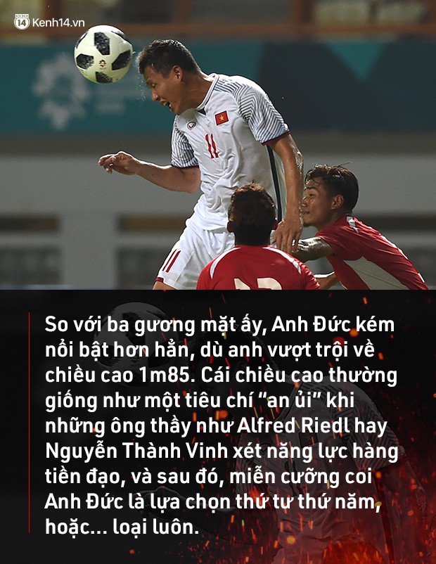 So với ba gương mặt ấy, Anh Đức kém nổi bật hơn hẳn, dù anh vượt trội về chiều cao 1m85. Cái chiều cao thường giống như một tiêu chí “an ủi” khi những ông thầy như Alfred Riedl hay Nguyễn Thành Vinh xét năng lực hàng tiền đạo, và sau đó, miễn cưỡng coi Anh Đức là lựa chọn thứ tư thứ năm, hoặc… loại luôn.