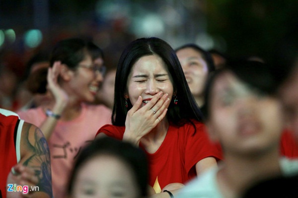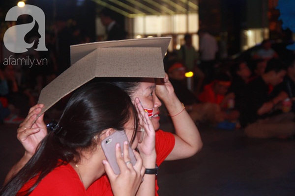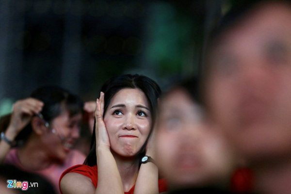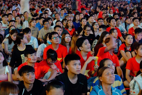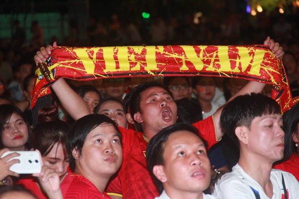 Phố đi bộ Nguyễn Huệ đã chật ních khán giả theo dõi trận đối đầu giữa đội tuyển Việt Nam và Thái Lan. Nhiều CĐV ôm đầu tiếc nuối vì Văn Toàn bỏ lỡ cơ hội ghi bàn vào lưới đội chủ nhà trong hiệp 1. Ảnh: Liêu Lãm.