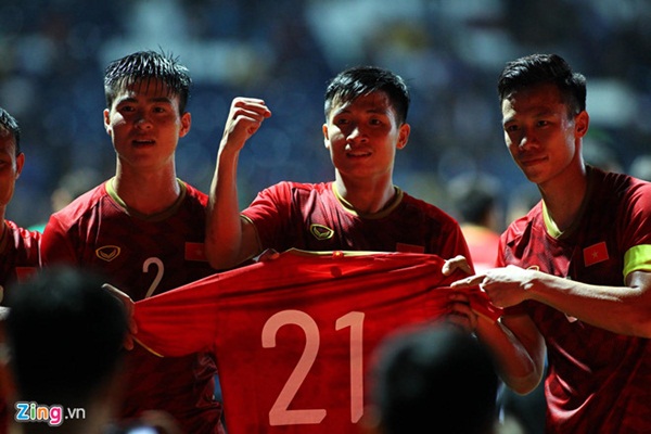 Trung vệ Trần Đình Trọng, Đỗ Duy Mạnh và Bùi Tiến Dũng giương cao chiếc áo đấu số 21 để gửi lời động viên tới Trần Đình Trọng phải nghỉ thi đấu vì chấn thương dây chằng. Cầu thủ đang khoác áo CLB Hà Nội phải nghỉ thi đấu tiến hành phẫu thuật và cần ít nhất 6-8 tháng để bình phục hoàn toàn chấn thương. Điều này đồng nghĩa với việc anh sẽ nói lời chia tay với phần còn lại của mùa giải V.League 2019 và SEA Games cuối năm tại Philippines.