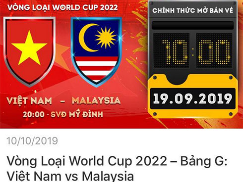 Đúng 10h00 ngày 19/9, Liên đoàn bóng đá Việt Nam đã mở bán vé online đợt đầu tiên trận đấu giữa ĐT Việt Nam và Malaysia ở vòng loại World Cup 2022 trên ứng dụng VinID. Tương tự những lần trước, lần này, tình trạng nghẽn mạng, cháy vé vẫn diễn ra.