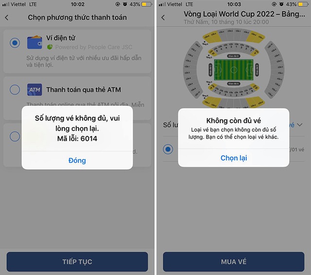 Theo ghi nhận của phóng viên, chỉ sau 3 phút mở bán, người mua đã nhận được thông báo “Không còn đủ vé”. Ngay cả khi truy cập tới phần “Chọn phương thức thanh toán” thì người mua vẫn nhận được thông báo “Số lượng vé không đủ, vui lòng chọn lại”.