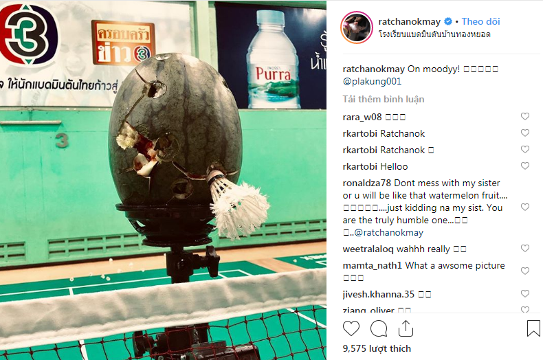 Trên trang cá nhân, tay vợt Ratchanok Intanon đã tải lên bức ảnh cô đập cầu làm vỡ một trái dưa hấu.