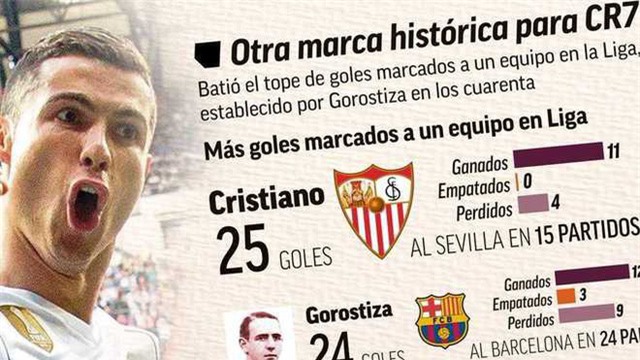 Chưa dừng lại ở đó, với cú đúp vào lưới Sevilla ở La Liga, cuối tuần qua, C.Ronaldo đã nâng số bàn thắng vào lưới đối thủ này lên… 25 bàn sau 15 trận. CR7 trở thành cầu thủ ghi nhiều bàn thắng nhất vào lưới 1 CLB ở La Liga. Kỷ lục cũ thuộc về huyền thoại Guillermo Gorostiza, người đã ghi 24 bàn thắng vào lưới Barcelona trong quá khứ.