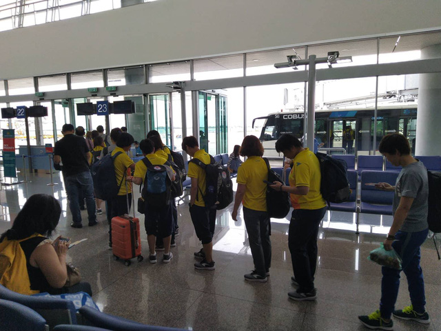 Toàn đội bước ra máy bay để di chuyển sang Indonesia