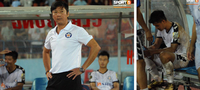 Đức Chinh cúi gằm mặt thể hiện sự thất vọng với chính bản thân. Còn HLV Huỳnh Đức cũng chẳng thể vui vẻ với 1 điểm có được.