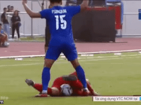 Đức Chính ngã ra vì đau đớn, cầu thủ Thái Lan vẫn gẩy bóng ra đá tiếp.
