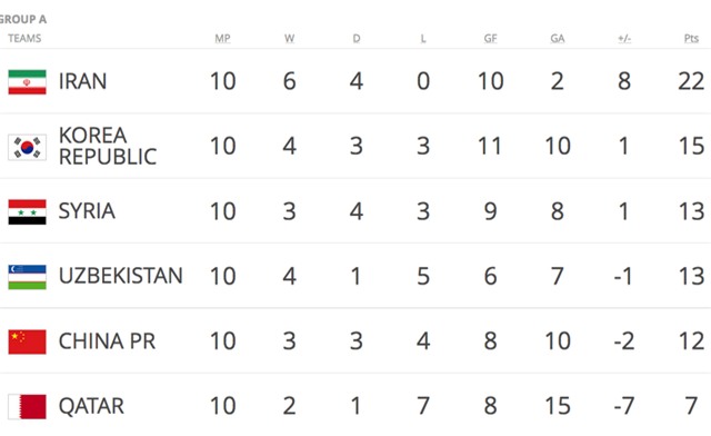 Kết thúc các trận vòng bảng, Hàn Quốc được 15 điểm, xếp nhì bảng A. Riêng Uzbekistan mất luôn vị trí thứ ba về tay Syria. 2 đội vừa nêu có cùng 13 điểm, nhưng Syria xếp trên nhờ hơn chỉ số phụ.