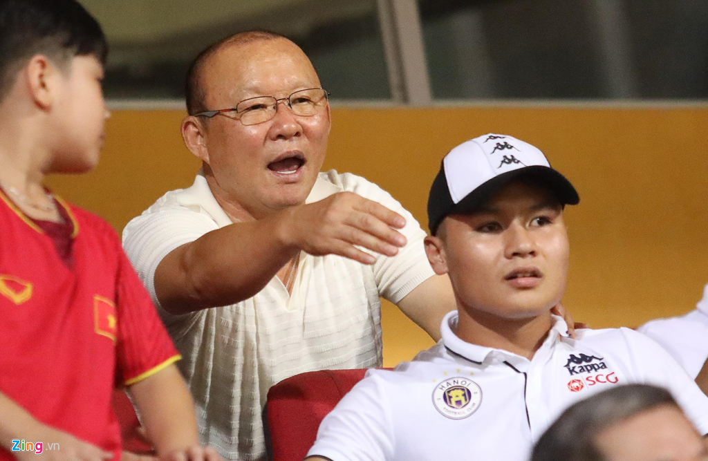 Tối 30/6, trận đấu giữa CLB Hà Nội và CLB Hồng Lĩnh Hà Tĩnh trên sân Hàng Đẫy có sự hiện diện của HLV Park Hang Seo trên khán đài. 2 người xuất hiện cùng ông là trợ lý Lee và tiền vệ Quang Hải.