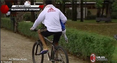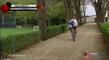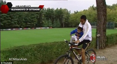 Trong clip này, chân sút Milan đang đạp xe đạp quanh trung tâm luyện tập của đội chủ sân San Siro. Đáng nói là Robinho đã lái xe chỉ với 1 tay còn tay kia ôm một em bé chừng 2-3 tuổi.