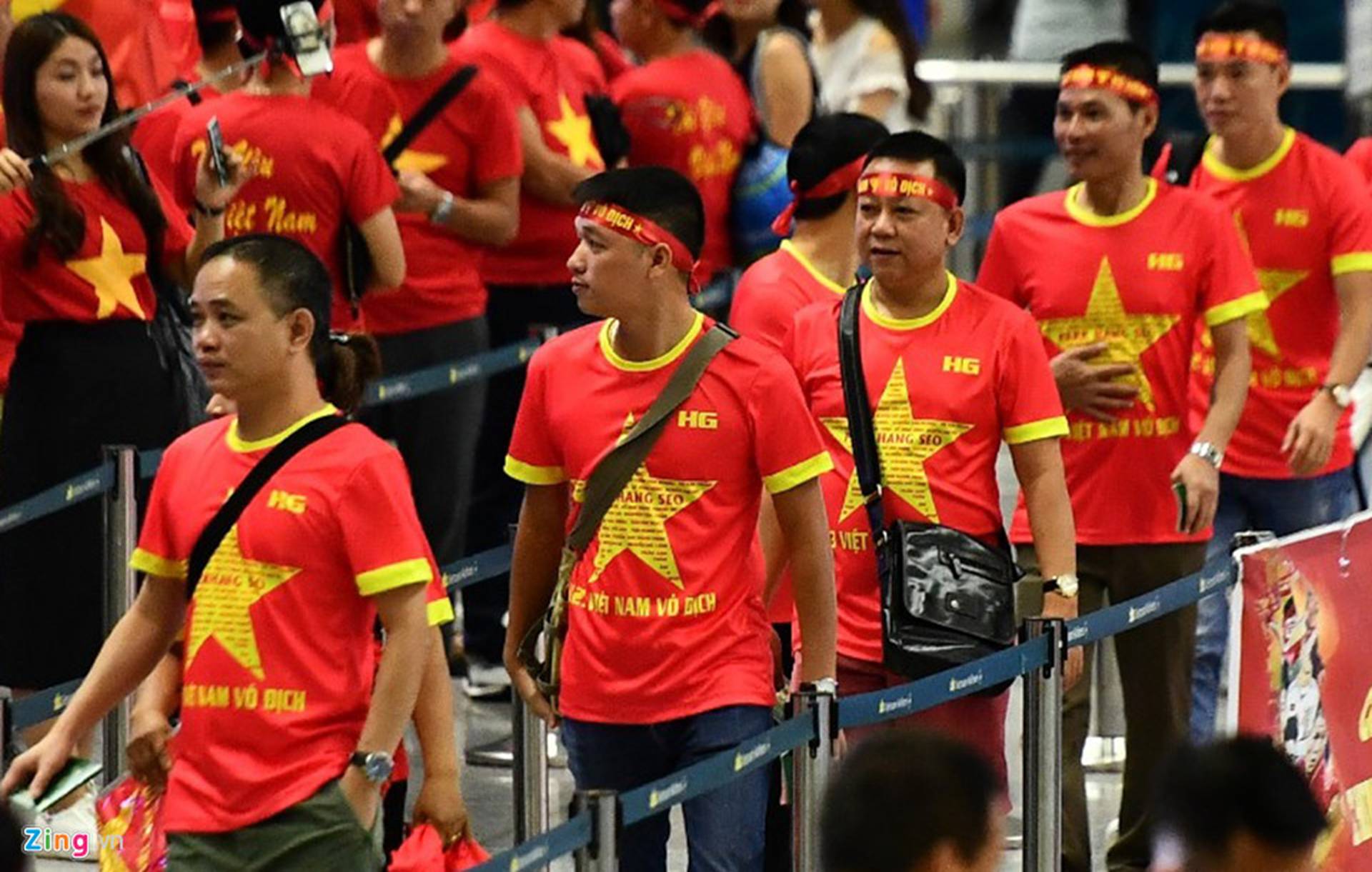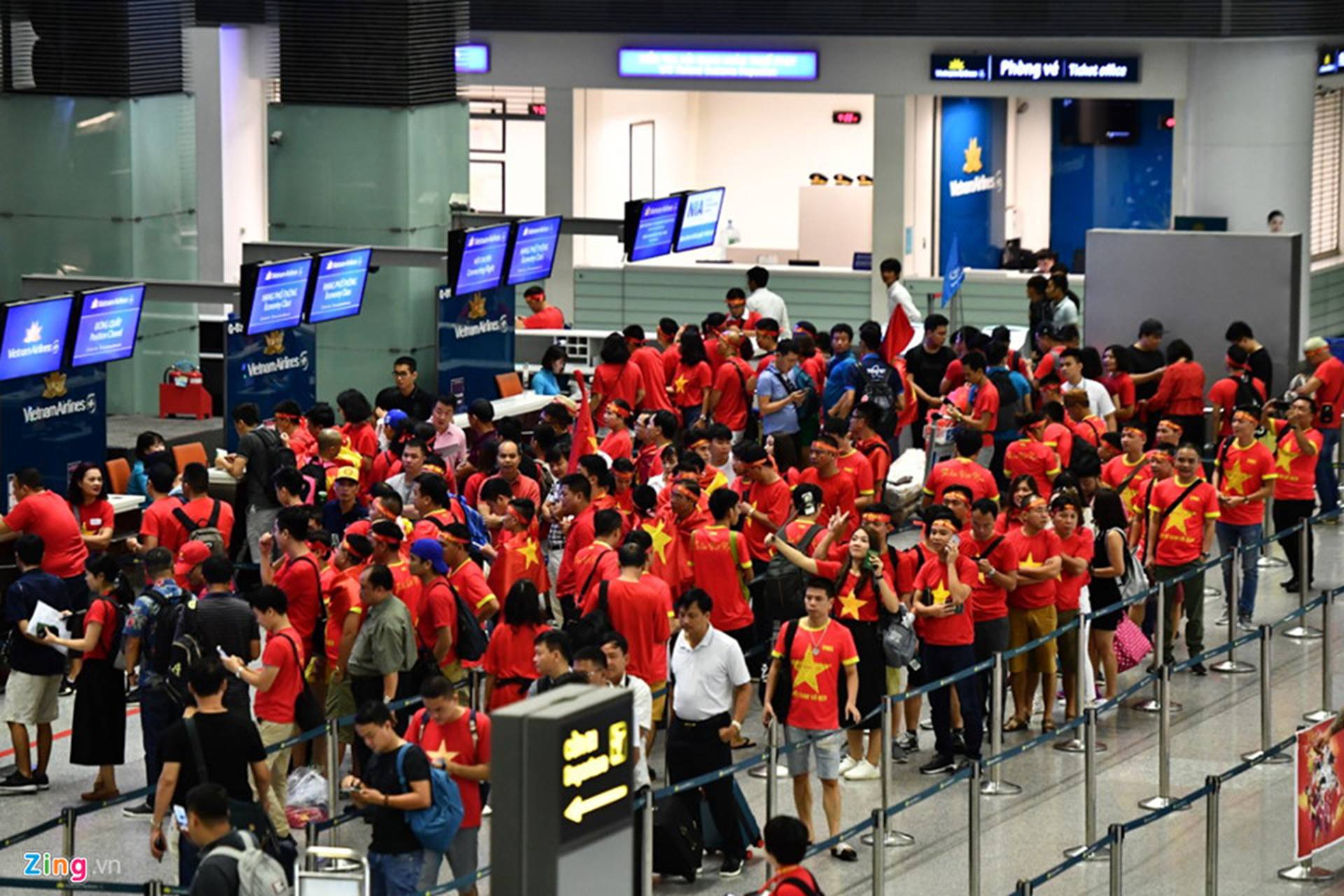 | Từ 4h sáng, đã có rất đông các cổ động viên (CĐV) Việt Nam nhuộm đỏ rực một góc quầy làm thủ tục tại ga đi quốc tế Tân Sơn Nhất, với đồng phục áo hình quốc kỳ Việt Nam. |