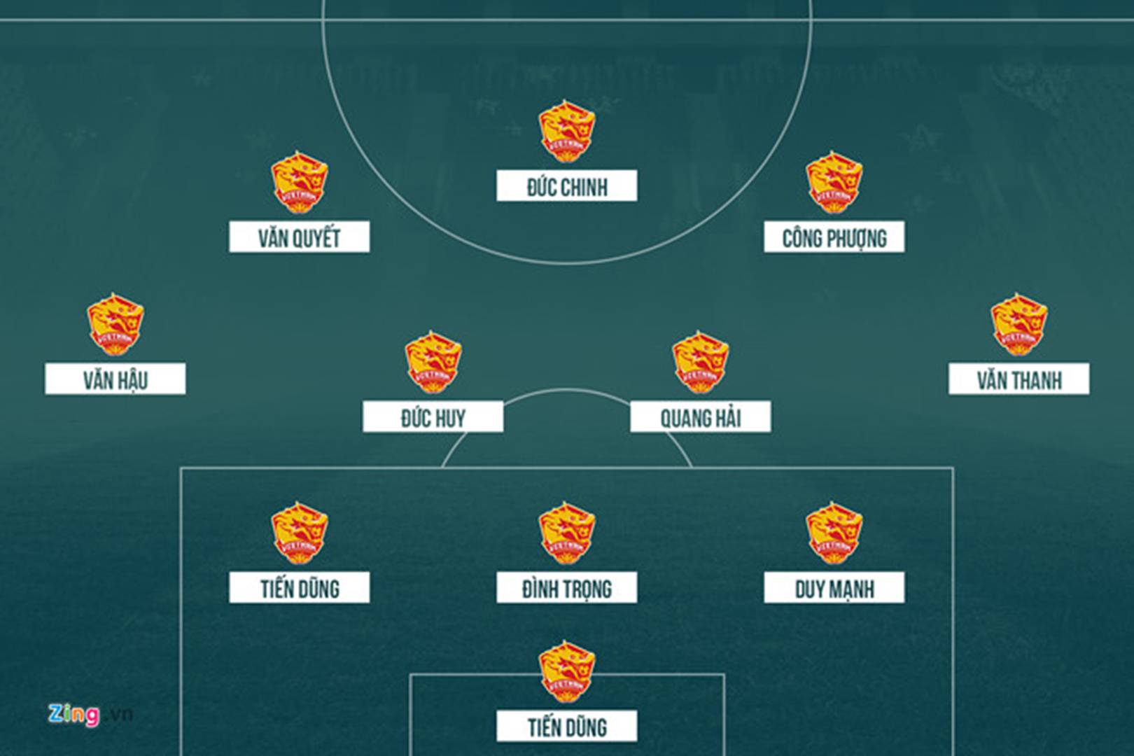 11 cầu thủ đá chính gồm: Bùi Tiến Dũng (thủ môn), Duy Mạnh, Đình Trọng, Tiến Dũng, Văn Hậu, Văn Thanh, Đức Huy, Quang Hải, Công Phượng, Văn Quyết, Đức Chinh.