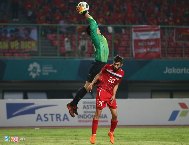Thủ môn Bùi Tiến Dũng tiếp tục đem đến sự yên tâm cho đồng đội với pha bắt bóng bổng chính xác. Anh giúp đồng đội thêm tự tin trước sức ép từ phía Olympic Syria. Ảnh: Việt Hùng (từ Indonesia).