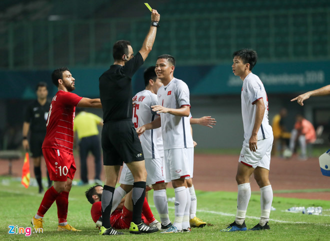 Trung vệ Duy Mạnh nhận thẻ phạt đầu tiên của trận đấu sau pha vào bóng quyết liệt với cầu thủ Syria. Olympic Việt Nam chưa thể đẩy cao đội hình nhằm gây áp lực lên khung thành đối phương.