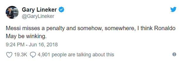 Bình luận viên nổi tiếng của Sky Sport, Gary Lineker mỉa mai pha bỏ lỡ của Messi khi cho rằng ở nơi nào đó, đại kình địch Ronaldo đang nháy mắt.
