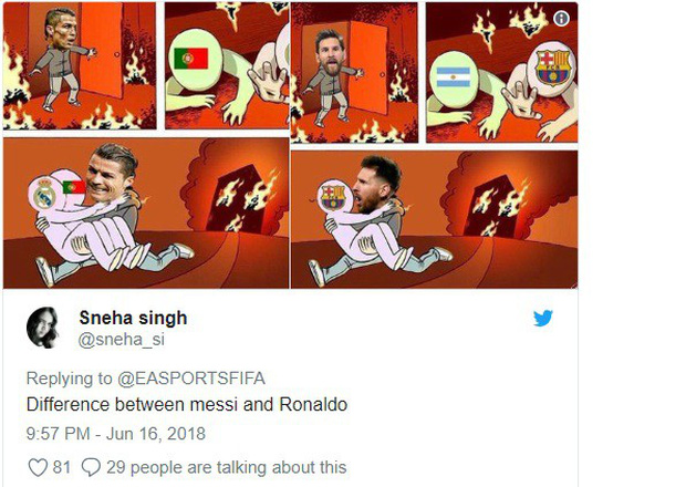 Chứng kiến màn thể hiện nhạt nhòa cùng với pha sút hỏng 11m của Lionel Messi trong trận gặp Iceland, cộng đồng mạng đã có những bức ảnh chế để so sánh siêu sao người Argentina với Ronaldo.