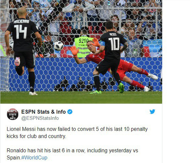 Messi sút 10 quả penalty thì hỏng đến 5 quả trong màu áo câu lạc bộ lẫn đội tuyển. Ronaldo thì thành công đến 6 quả, có cả bàn thắng vào lưới Tây Ban Nha.