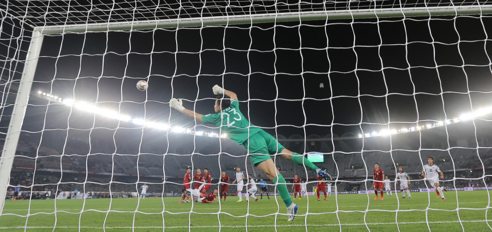 Có thể nhìn thấy rõ trong tình huống này, bóng đã rời chân Ali Adnan hướng vào góc phải nhưng phần trên cơ thể của Văn Lâm vẫn hướng về phía bên trái. Ảnh: Getty Images