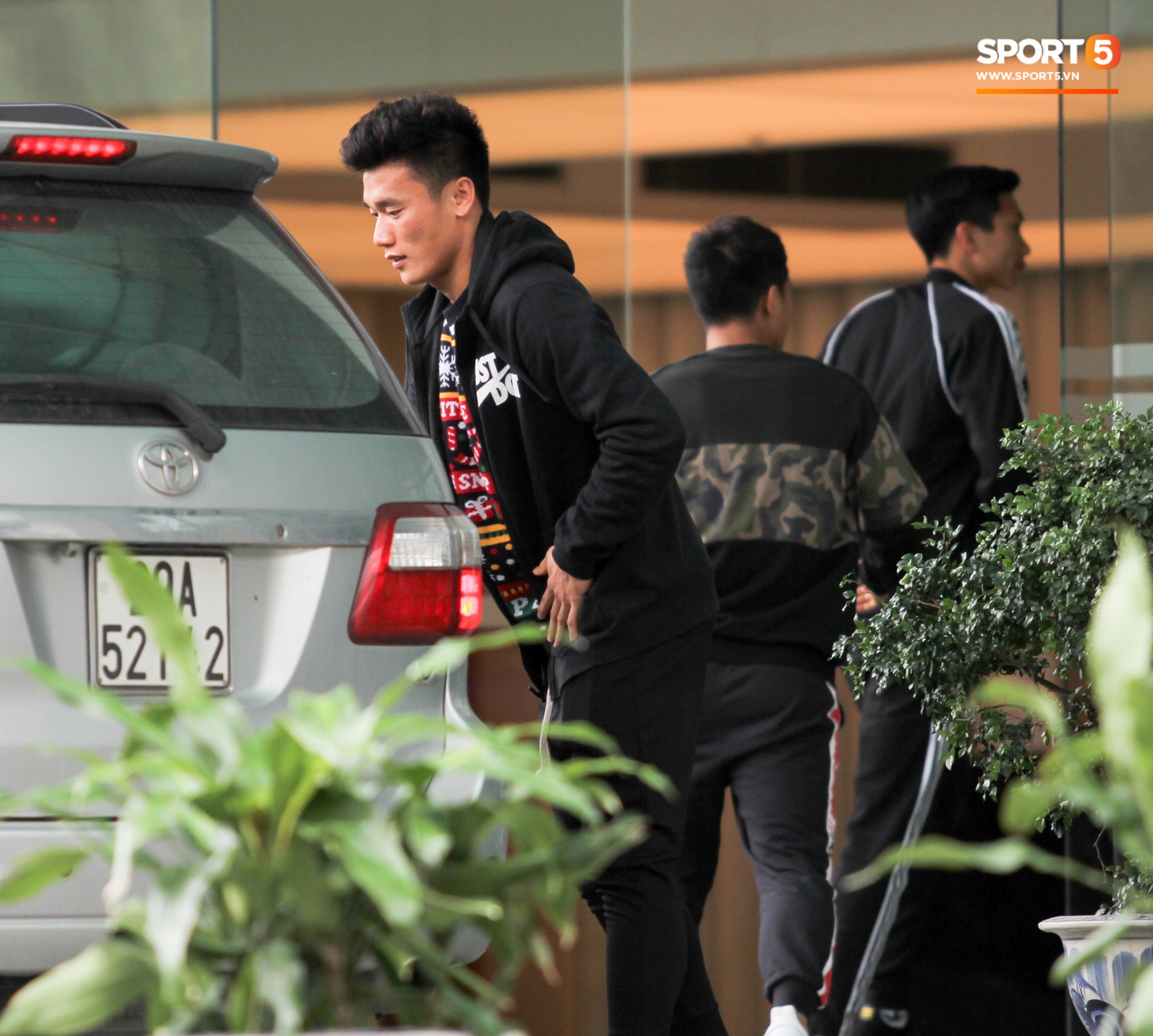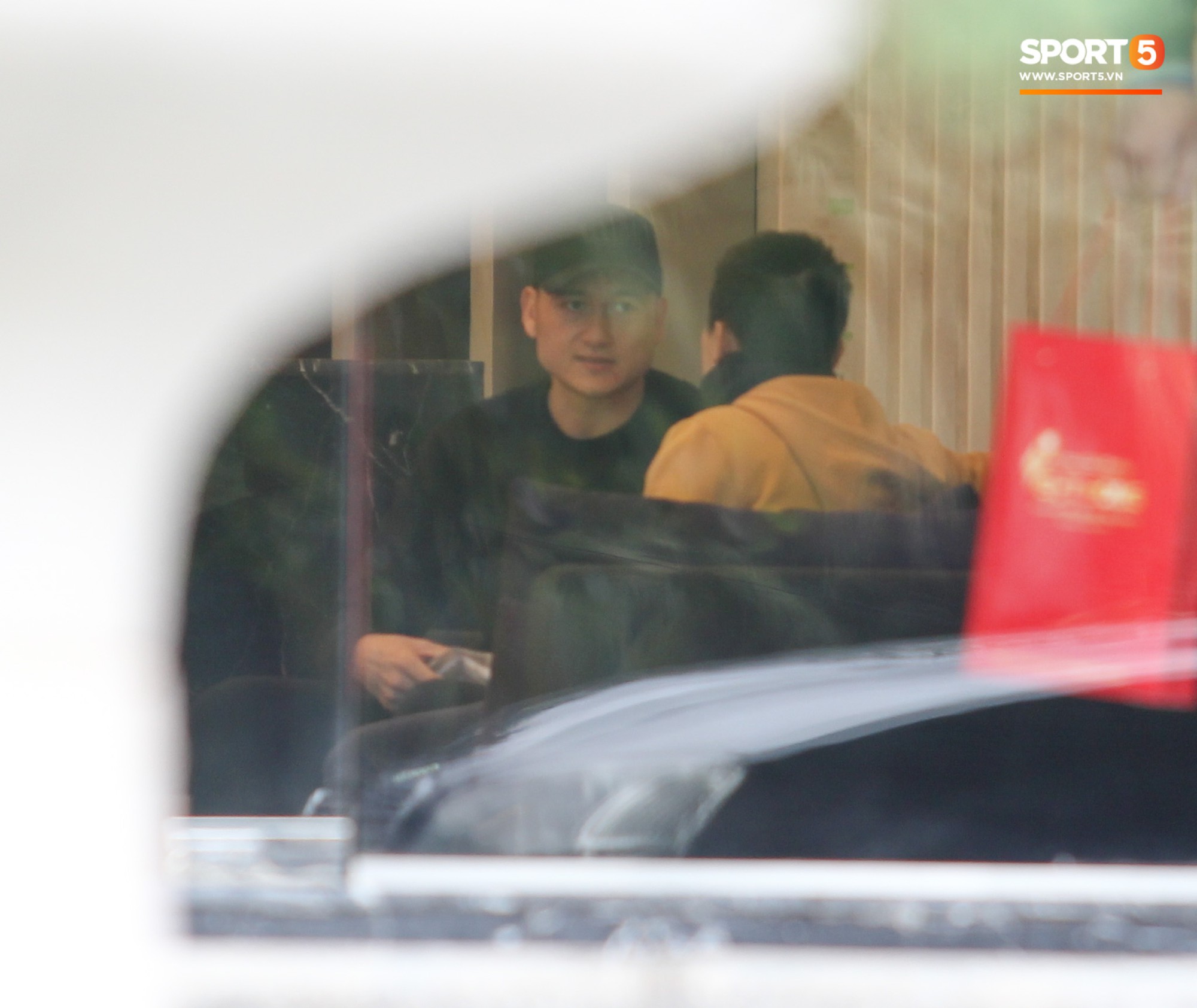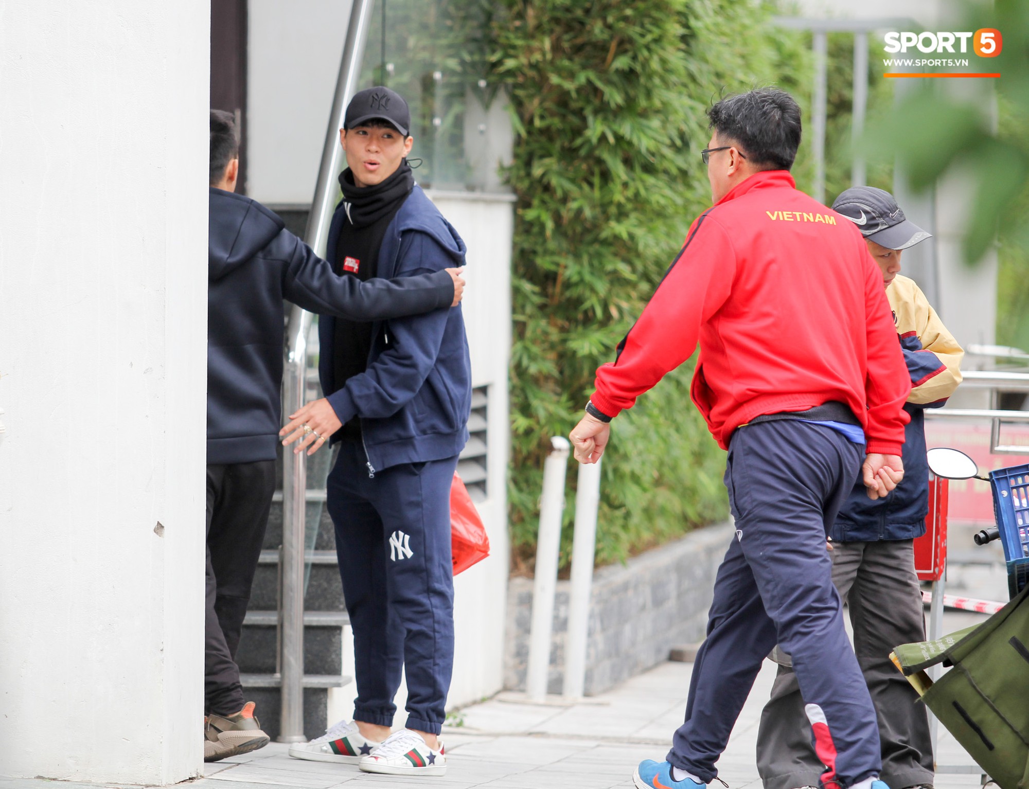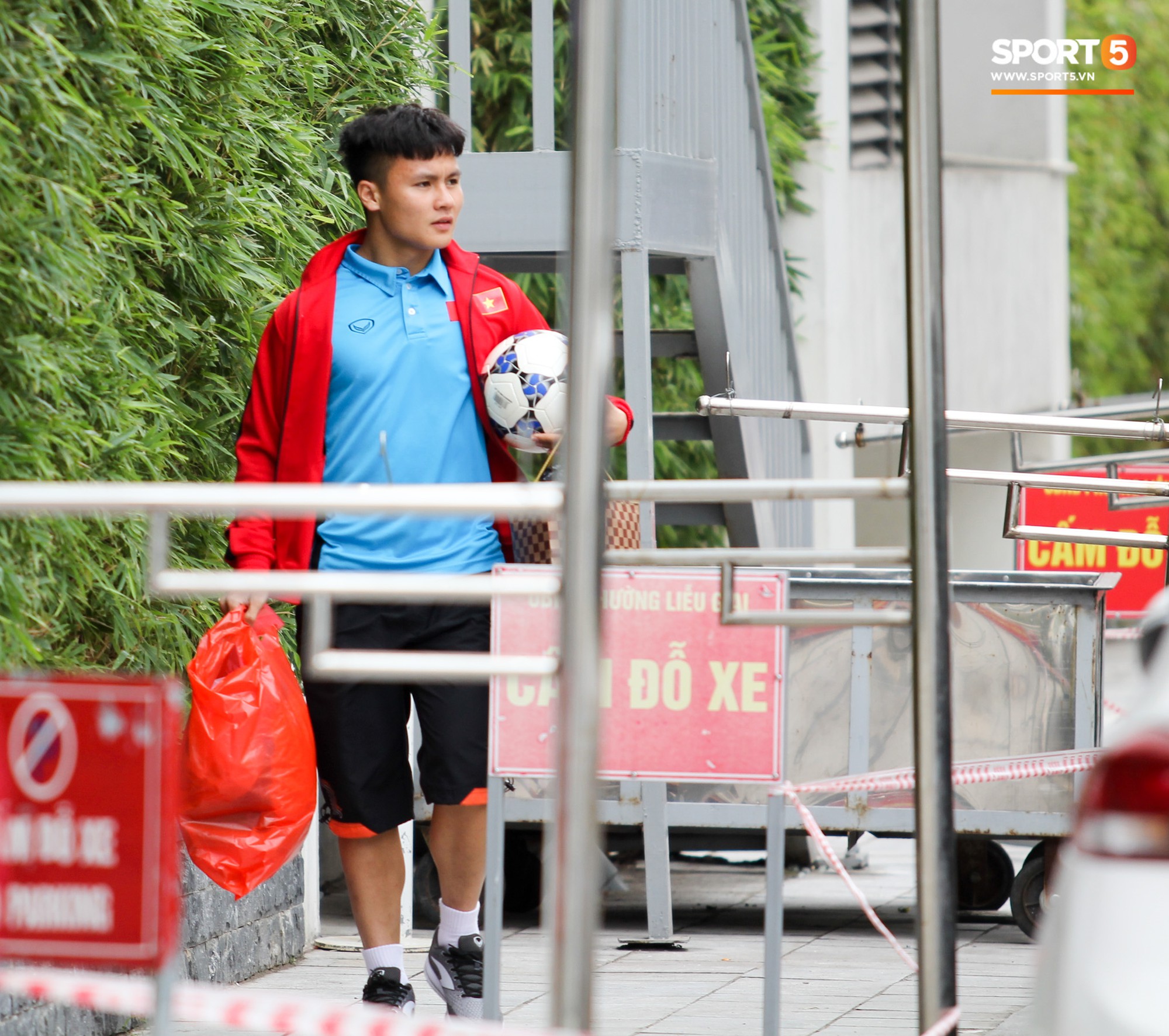 Sau khi lên phòng thay đồ, Quang Hải mặc lại đồ thể thao và chạy xuống cổng nhà khách để lấy đồ. Anh đem theo một túi đựng áo và một quả bóng. Giữa tiết trời giá rét, Hải "con" vẫn chỉ mặc 1 áo phông, 1 áo khoác cùng 1 quần ngố. Ảnh: Nhân Văn.
