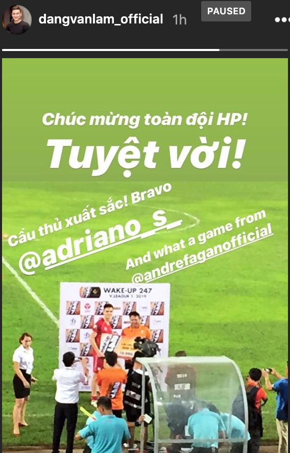 Đặng Văn Lâm đăng trên story chúc mừng chiến thắng 3-2 của CLB Hải Phòng trước Bình Dương.