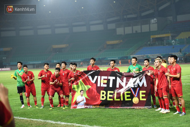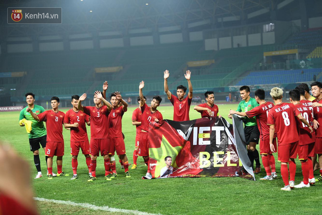 Sau trận thắng Bahrain ở vòng 1/8 ASIAD 2018, các cầu thủ Olympic Việt Nam như thường lệ tiến về một góc sân cảm ơn người hâm mộ bằng điệu vỗ tay kiểu viking.