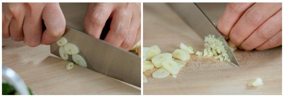 Tỏi bóc vỏ chia đôi, một nửa thái lát mỏng 1 nửa băm nhỏ.