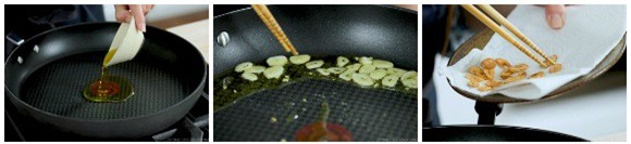 Vẫn trong chảo đó, cho tỏi băm vào phi tỏi cho thơm.