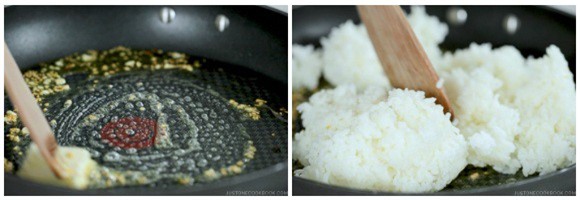 Cho bơ vào khi bơ vừa chảy hết thì đổ cơm vào chiên.