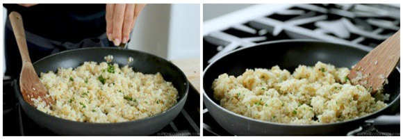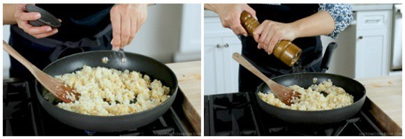 Thêm nước tương, muối, hạt tiêu vào, đảo đều. Rang cho tới khi hạt cơm săn lại.
