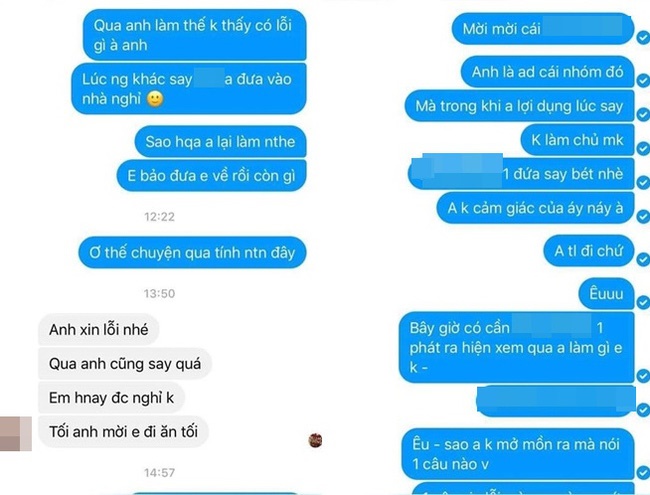 "Qua anh làm thế không thấy có lỗi gì à anh, anh người khác say anh đưa vào nhà nghỉ. Sao hôm qua anh lại làm như thế, em bảo đưa em về rồi còn gì?", cô gái nhắn hỏi.
