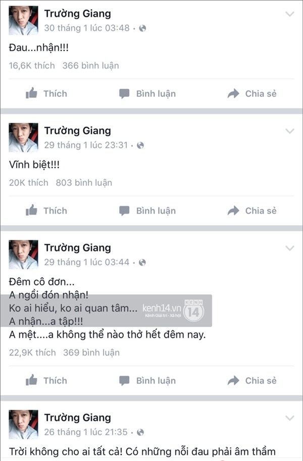 Trong những ngày đó, Trường Giang liên tục viết những dòng mang ý nghĩa tiêu cực, buồn bã trên trang của mình.