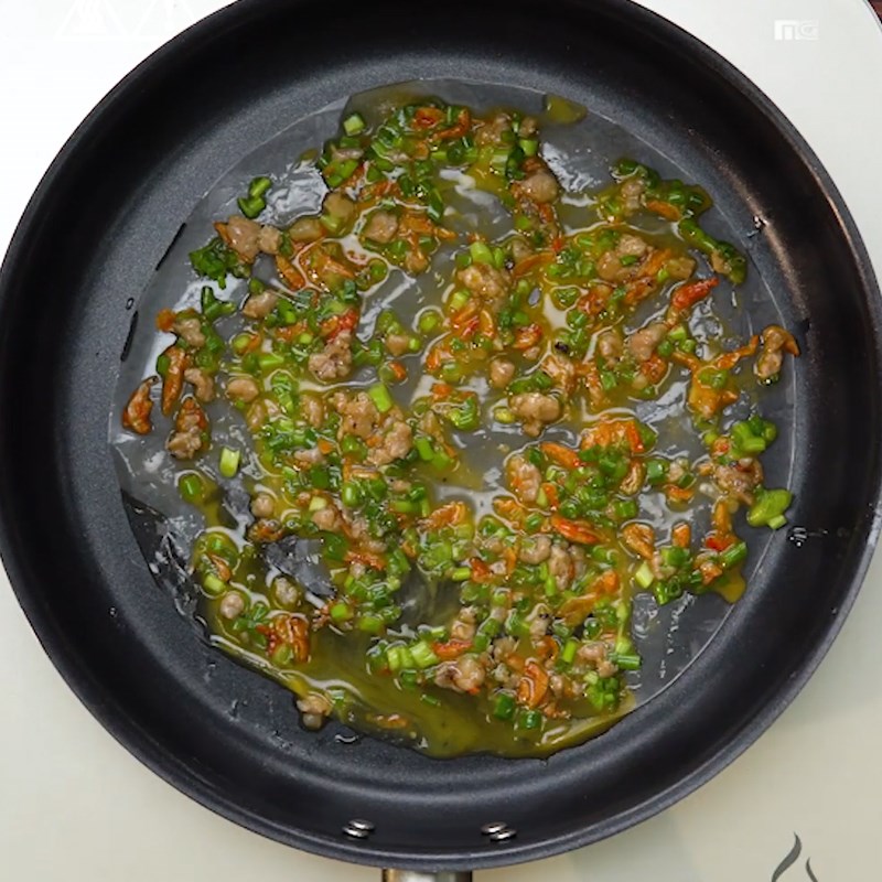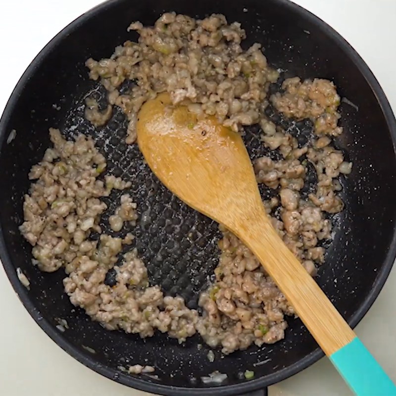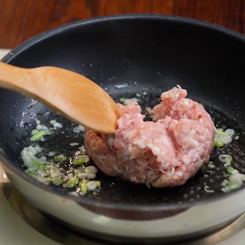- Khi hành chuyển hơi vàng, bạn thêm thịt băm vào xào với lửa vừa. Thêm 1 muỗng cà phê tiêu, 1 muỗng canh hạt nêm, 1 muỗng canh đường, 1/8 muỗng cà phê muối .