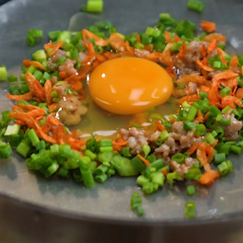 - Bạn dùng muỗng tạo lỗ giữa thịt để đập trứng vào, sau đó dùng đũa hoặc muỗng đánh trứng ra sao cho trứng cút, hành lá, thịt băm, tép dàn đều hết mặt bánh tráng.