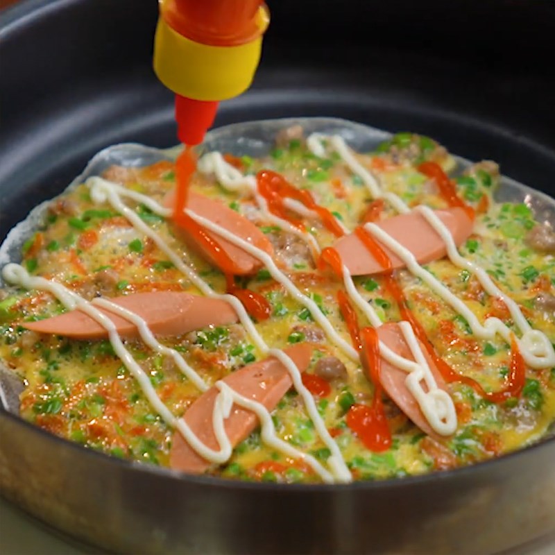 - Bạn thêm 6 - 7 lát xúc xích vào xếp trên bánh tráng, đậy nắp 4 phút để các nguyên liệu chín.