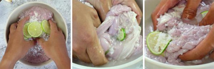 - Bạn lộn trái lòng non, rồi tiến hành tuốt hết dịch vàng với nước và muối, bóp đi bóp lại để loại bỏ chất nhầy bên trong.