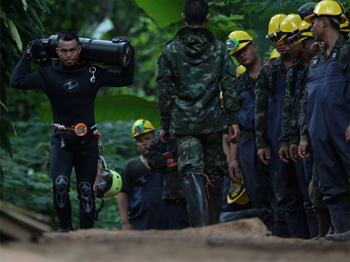 Vì sao chỉ giải cứu được 4 thành viên đội bóng Thái mỗi ngày? Mỗi cầu thủ cần sự hỗ trợ của 140 thợ lặn: 2 người bơi hộ tống, 8 người hỗ trợ trong hang và 120 người khác sẵn sàng ứng cứu ngoài cửa hang.