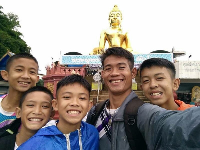 Các thành viên đội bóng nói các em không gặp bất kỳ con thú nào trong 10 ngày mắc kẹt. Tất cả những cậu bé được giải cứu đều không gặp vấn đề gì với thị lực, theo Bộ Y tế công cộng Thái Lan. Ảnh chụp huấn luyện viên và một số thành viên đội bóng trước khi mắc kẹt.