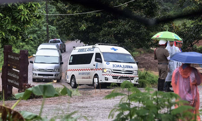 Quan chức Thái Lan cho biết người thứ 9 và thứ 10 của đội bóng đã được đưa ra khỏi hang Tham Luang trên cáng. Một xe cấp cứu được nhìn thấy rời khỏi khu vực.