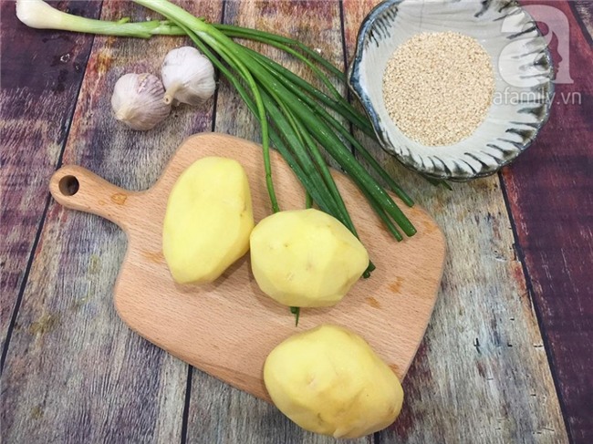 Dùng luôn chảo vừa chiên khoai, chắt bớt dầu ra, chỉ để lại khoảng 1 thìa canh. Cho tỏi băm vào phi vàng thơm, nhanh tay cho khoai tây, hành hoa, vừng rang và 1 thìa café gia vị vào xóc cho thật đều.
