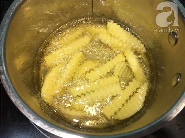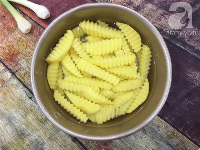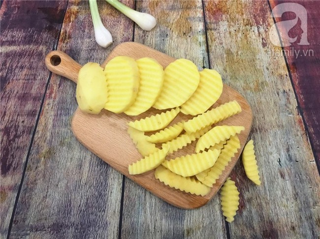 Khoai tây rửa sạch, gọt vỏ sau đó dùng dao răng cưa để thái thành những miếng dài.
