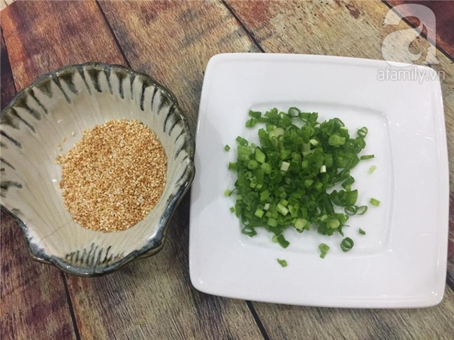 Vừng trắng rang vàng cho thơm. Hành hoa rửa sạch thái nhỏ. Tỏi băm nhuyễn.