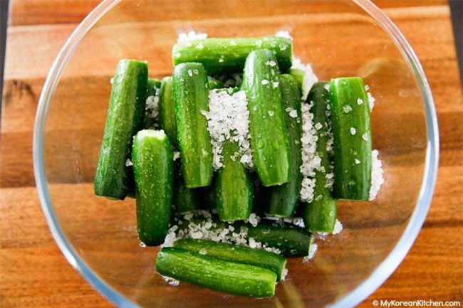 Dưa chuột rửa sạch, ngâm nước muối 30 phút sau đó để ráo. Cắt bỏ 2 đầu của dưa chuột, rắc 3 thìa súp muối lên xóc đều. Để 30 phút, thỉnh thoảng trộn lại để đảm bảo dưa chuột được ngấm muối. Sau 30 phút, lấy dưa chuột ra khỏi tô, loại bỏ phần muối thừa. Xếp dưa chuột vào hũ thủy tinh, thêm vài lát chanh đã thái vào.
