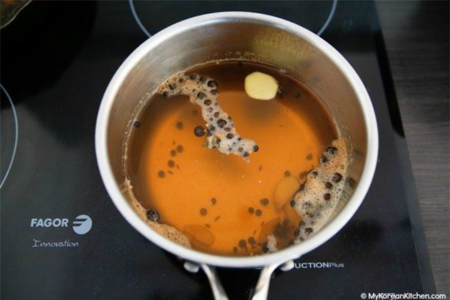 Cho tất cả nguyên liệu phần nước ngâm vào nồi trên lửa vừa cho tới khi đường tan hoàn toàn thì tắt bếp.