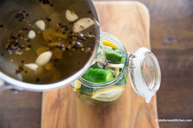 Đợi phần nước nguội thì từ từ đổ vào hũ dưa chuột. Đóng nắp lại, để ở nhiệt độ phòng khoảng 3 tiếng sau đó để vào ngăn mát tủ lạnh.