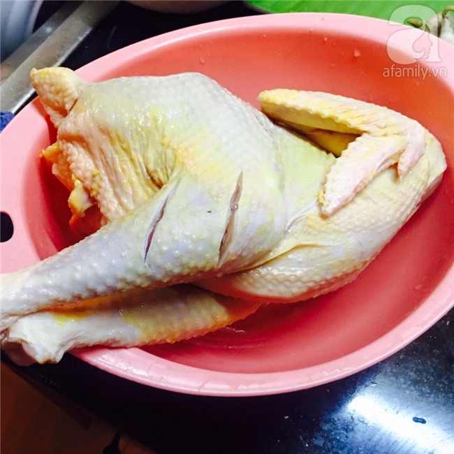 Thịt gà rửa sạch để ráo nước sau đó khứa vài đường chéo lên đùi gà để khi ướp gia vị được ngấm.