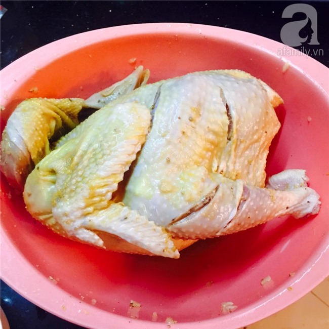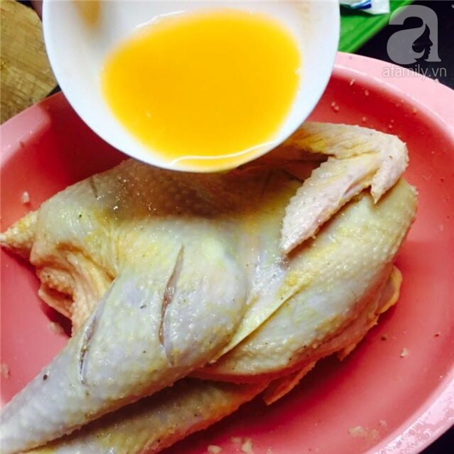 Cam vắt lấy nước, sau đó đổ tiếp lên gà, xoa nhẹ nhàng. Bọc kín gà để ngăn mát tủ lạnh ít nhất 1 giờ cho ngấm đều.