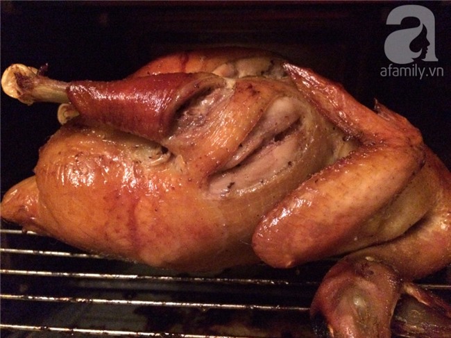 Bạn cho gà vào lò nướng tiếp khoảng 30-40 phút khi gà chín vàng là được sau đó để nguyên trong lò.