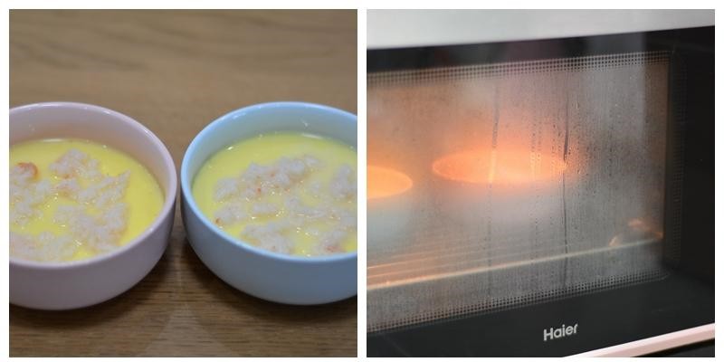 Lúc này bạn lấy trứng ra, cho tôm rải đều lên mặt trứng rồi cho vào lò thêm 5 phút nữa là được.