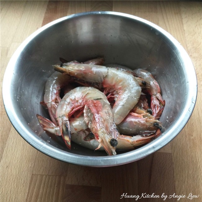 Tôm rửa sạch, cắt bỏ râu, chân. Để tôm ráo nước sau đó cho vào tô ướp với 1 thìa cafe muối.