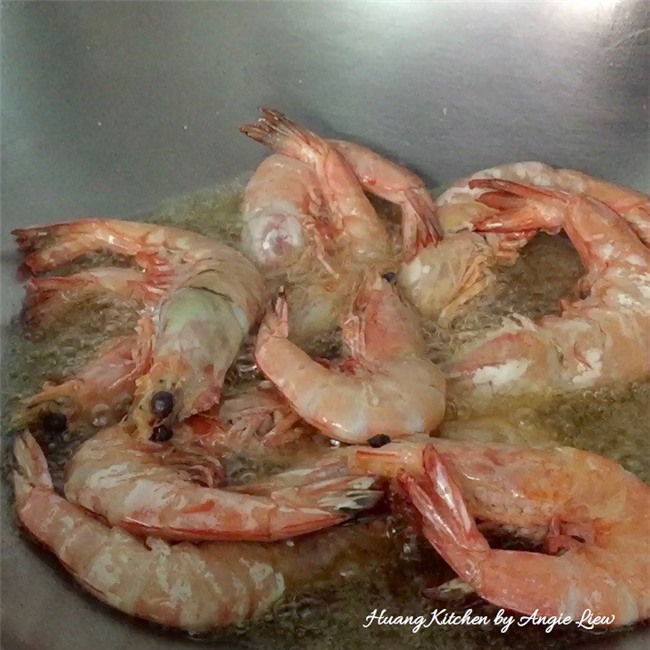 Bắc chảo lên bếp, cho dầu vào đun nóng thì thả tôm vào chiên vàng.